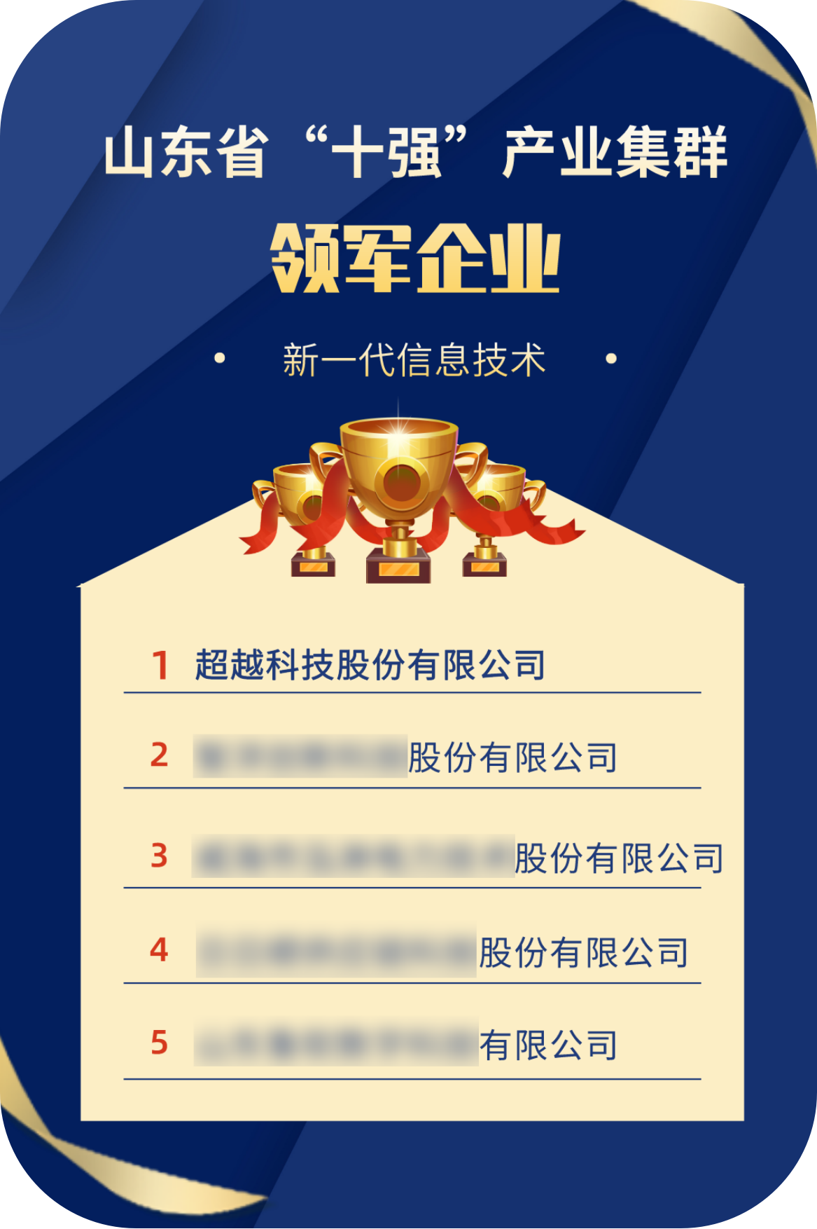 近日,山東省發展和改革委員會公示了2021年度全省“十強”產業“雁陣形”集群和集群領軍企業名單。超越公司成功入選集群領軍企業,同時在新一代信息技術領域位列首位!